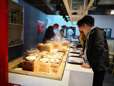 目前市場上,在消費者的心中,最能識別這個餐館是不是瀏陽蒸菜館的地方,非售賣臺莫屬了,傳統瀏陽蒸菜館的售賣臺一般有木質的和竹制的兩種形式,這種蒸籠的保溫方式最大優點是對蒸菜產品品質的保護。蒸菜都是通過蒸汽保溫,如果保溫太過就會導致蒸汽過量而化成湯水進入菜中,使得菜品的湯水過多影響口感,但是傳統大蒸籠就不會有這種情況,因為多余的蒸汽都被竹木材質吸收和縫隙中散發了,不會出現湯汁過多現象,反而大部分菜越蒸越香,越蒸越好吃。